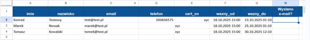 Imię, Nazwisko, Adres e-mail, Telefon (może kiedyś będę wysyłał SMS przez SMSAPI.PL), Numer seryjny (już tego nie używam), Ważny od (tego też nie), Ważny do, Wysłano e-mail?