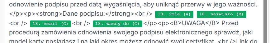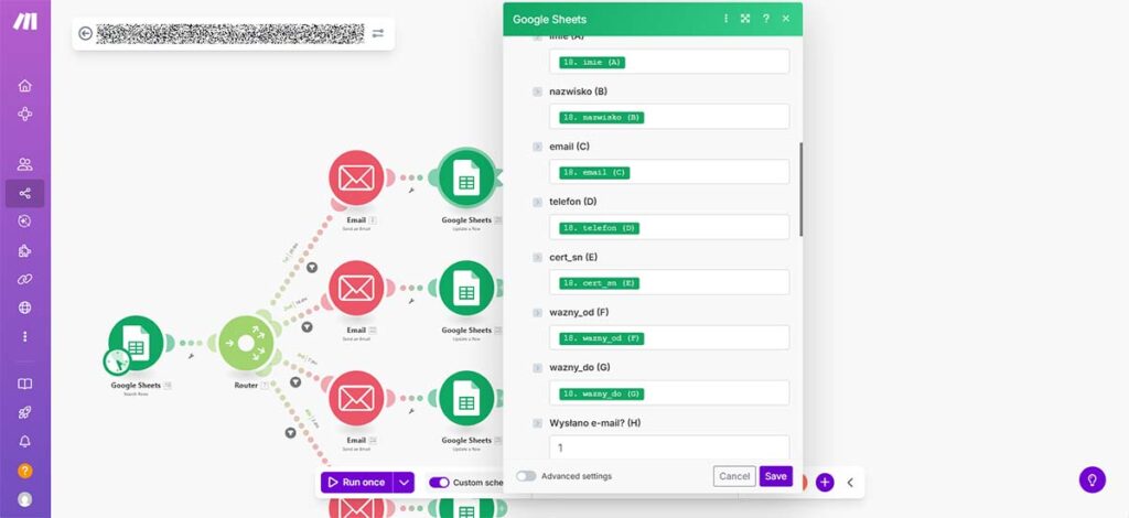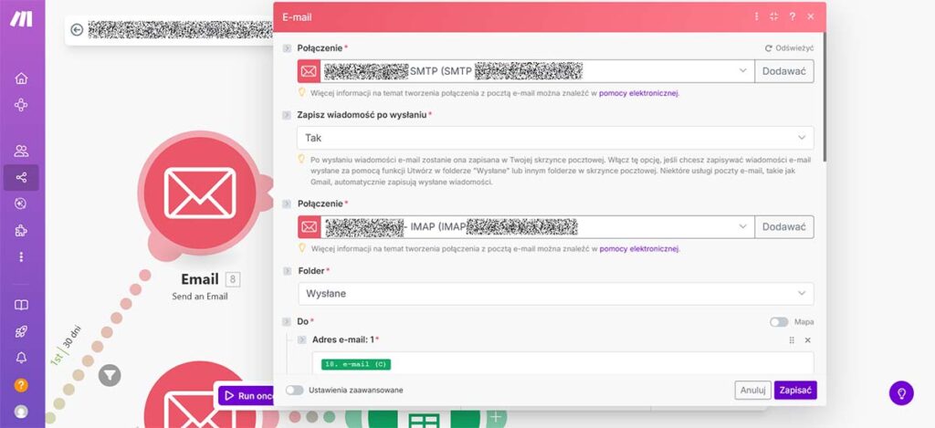 (#) W treści możesz wstawić pola dynamiczne (np. imię, nazwisko, datę ważności) — make.com podpowie Ci je z arkusza.