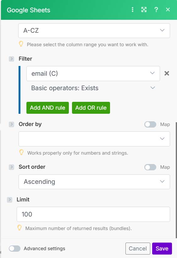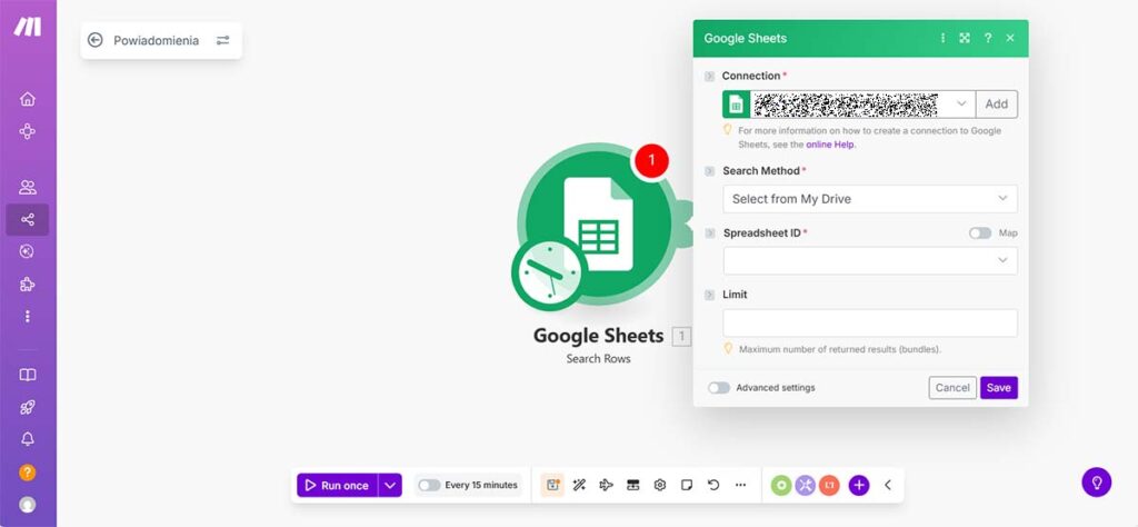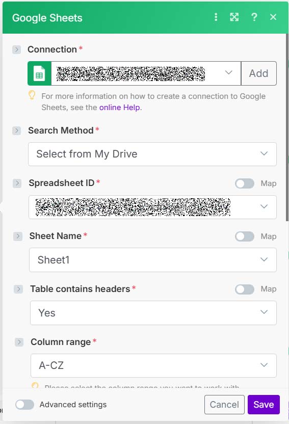 - Wybierz arkusz (Spreadsheet ID) i skoroszyt (Sheet Name).