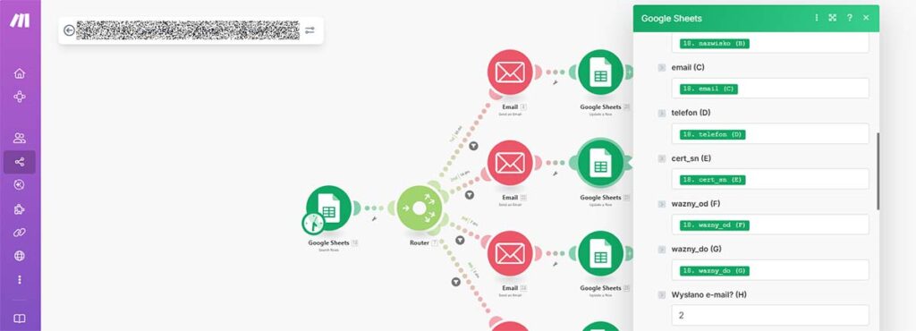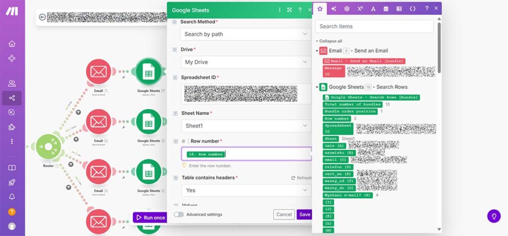 Ostatni kafelek — po wysłaniu maila, make.com wpisuje w kolumnie Wysłano e-mail? wartość 1.Warości dla poszczególnych kolumn ja je „przepisuję” bo jak zostawiam puste to czyści mi wpisy 😉 Klikam w puste pole i wybieram. Pamiętaj by w kolumnie H ustawić ręcznie „1” jak na przykładzie.
