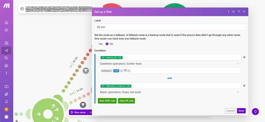 Skopiuj gałąź z powiadomieniem „30 dni” i zmień warunek na „14 dni” oraz wartość w kolumnie „Wysłano e-mail?” z pustego na 1.