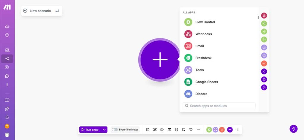 Na początek po zalogowaniu się do make.com – kliknij w + Create scenario.